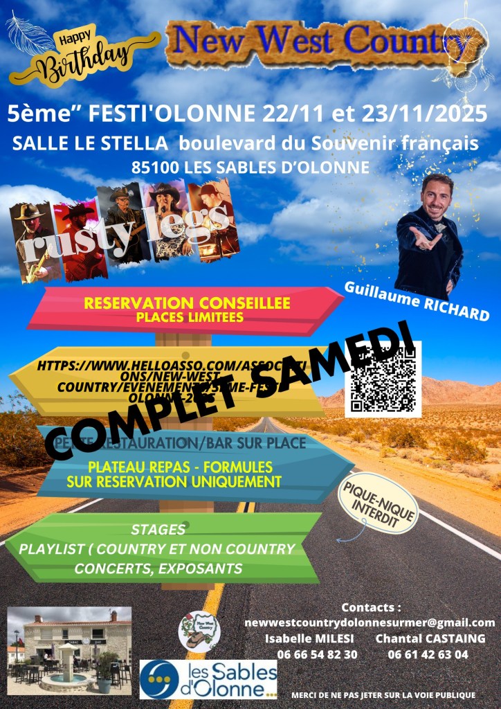 Nous vous accueillerons dans une nouvelle salle, Le Stella, l’autre n’étant pas disponible à cette date, ainsi que Les Rusty legs pour 2 concerts, et notre cher Guillaume Richard pour des workshops tous niveaux et tous styles Nous vous invitons vivement à réserver (lien helloasso ou fiche de réservation diffusés courant avril 2025), car les places seront limitées, même si l’endroit est très grand, votre confort pour danser reste notre priorité. Nous comptons sur vous pour faire du Festi’Olonne 5 un super week-end. Restez en alerte sur les infos à venir