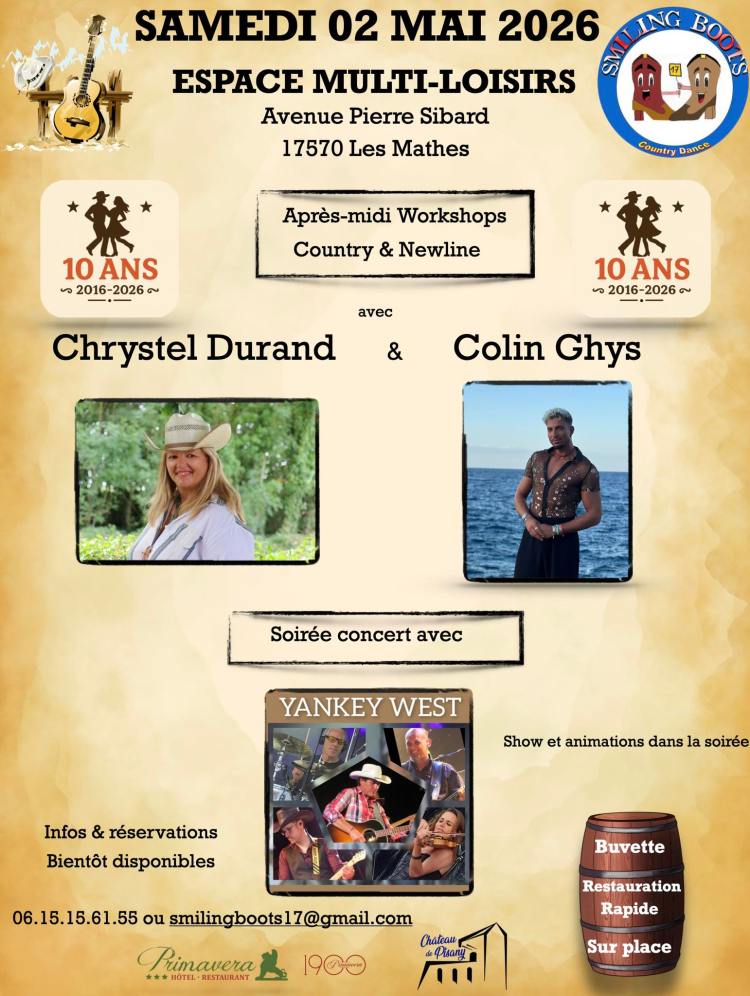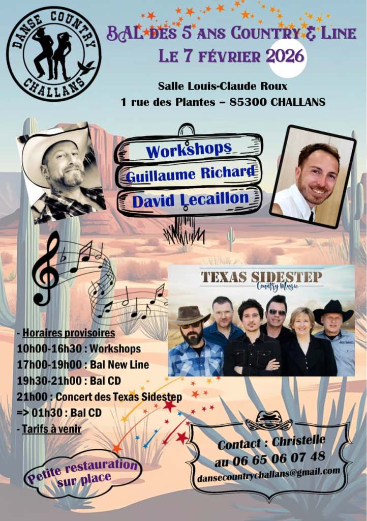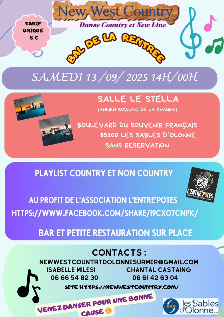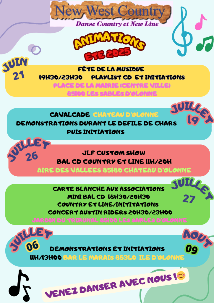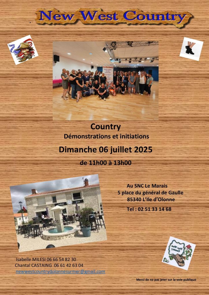 Rejoignez-nous pour une initiation gratuite à la danse country et line dance avec l’association New West Country Olonne Sur Mer ! Venez découvrir, danser, et surtout vous amuser ! Les Sables d’Olonne Samedi 26 Juillet 2025 Entrée gratuite