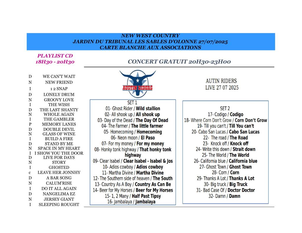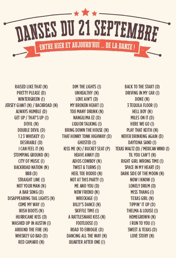 New west country aura le plaisir de vous faire danser sur une playlist CD de 11h à 20h entrecoupée d’animations exceptionnelles à couper le souffle. Pendant les pauses, on boit un verre, on mange un morceau, on regarde les shows.