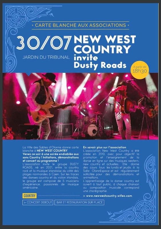 - Carte blanche aux associations : New West Country invite le groupe « Dusty Road » au jardin du tribunal des Sables d’Olonne…